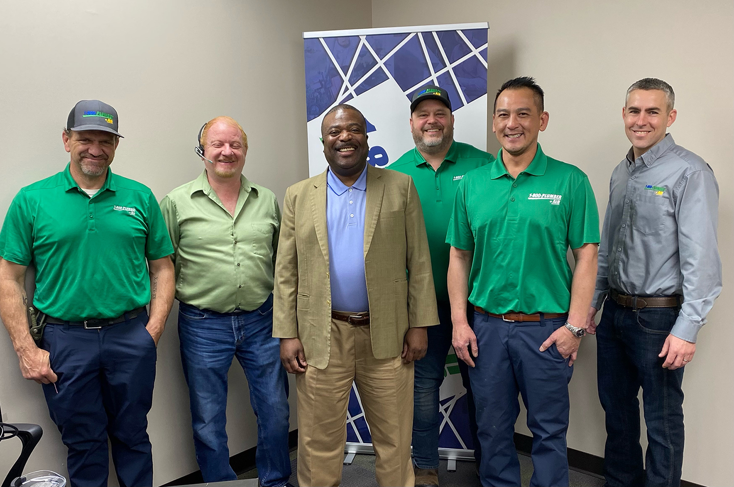 CUTLINE: Franchise owner, Elvis Neckles (center), and 1-800-Plumber +Air CEO, Mark Collins (far-right) pictured with the 1-800-Plumber +Air of Huntsville team.