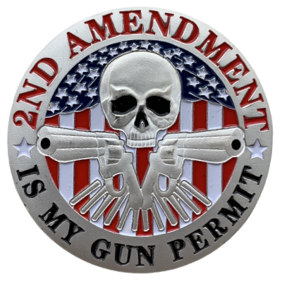 The new silver-plated coin features a distinctive skull design over the red, white, and blue of the American flag. On the rear is a patriotic bald eagle encircled by the slogan “Second Amendment – Protect & Defend.”