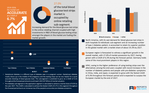 The global blood glucose test strips market is forecast to reach USD 6.92 Billion by 2027, according to a new report by Reports and Data. Blood glucose strips are one of the key components to test the glucose level of a sample blood. The sample blood is put onto the strip and then the other end of the test strip is placed inside the blood glucose test meter. The glucose oxidase provided by each test strip help determine the testing meter of the glucose level of blood. The global market is growing at a substantial pace as the amount of diabetes patients and patients with pre-diabetes symptoms are drastically being propelled. Type 2 diabetes by application is calculated to dominate the market. Amongst the end-users, the hospitals sub-segment is leading in the market due to the highest number of test and use of the strips in the hospitals.
