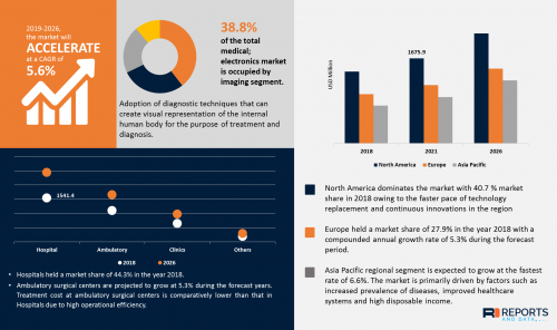 According to the current analysis of Reports and Data, the global Medical Electronics market was valued at USD 3,476.7 Million in 2018 and is expected to reach USD 5,389.2 Million by the year 2026, at a CAGR of 5.6 %. Factors such as the growing standard of living, increasing aging population, rising health awareness, and increasing adoption of wearable electronics are driving the growth of the medical electronics market. The growing importance of medical electronics for patient tracking and other monitoring activities is further expected to propel the growth of the medical electronics market.