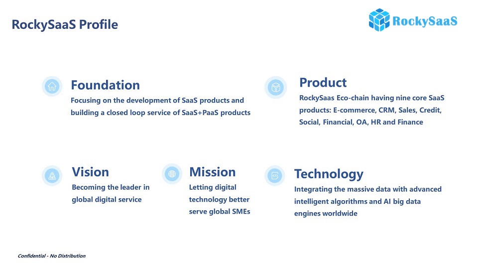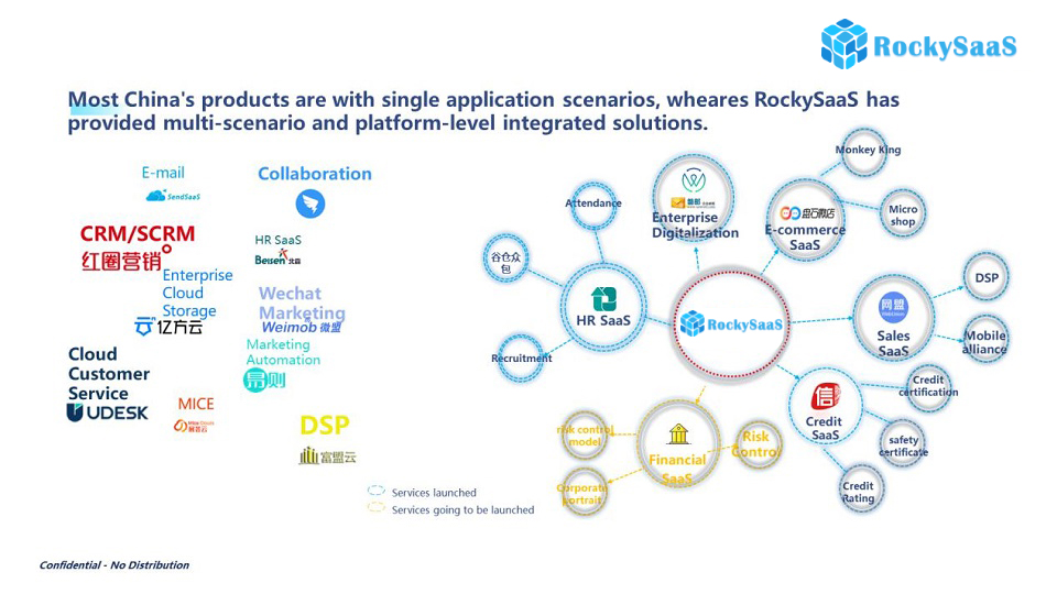 Since 2011, RockySaaS, aiming at big data and artificial intelligence (AI) as core technologies, has built a platform with SaaS products such as E-commerce, CRM, Sales, Social, and HR for better reaching the SaaS market.